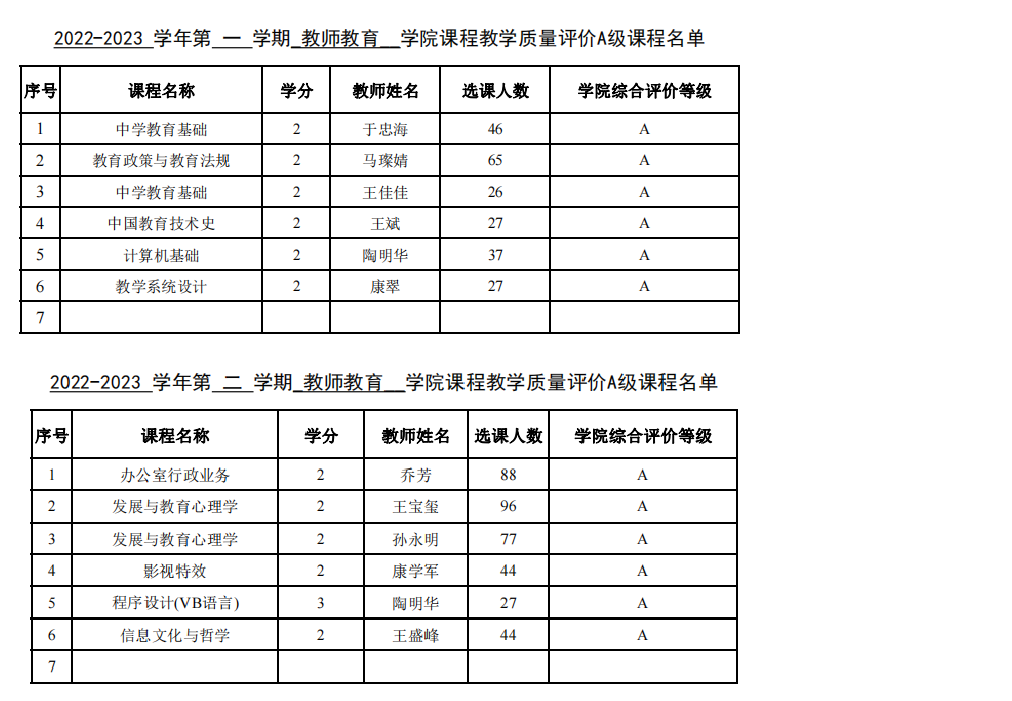2022-2023学年A级课程(比例按教务处规定不超过教学班总数的20%),现予以公示,公示期三天。