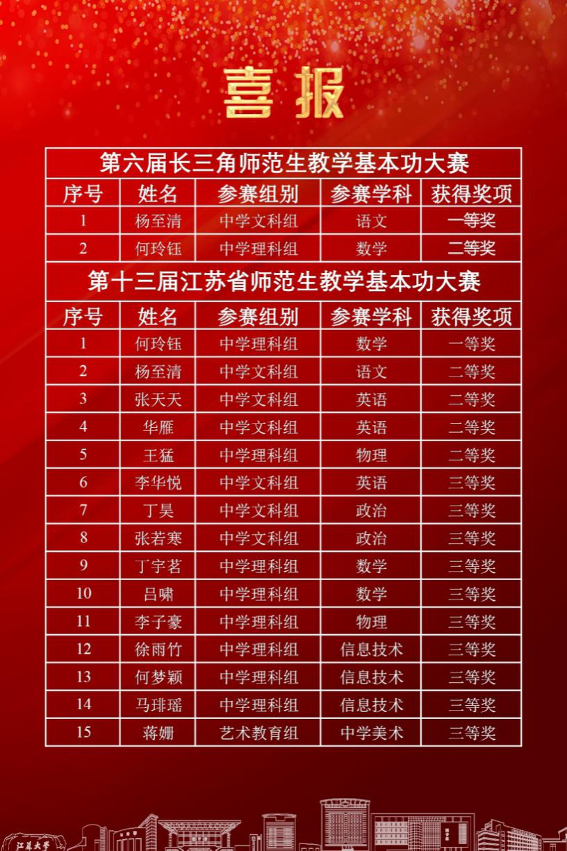 第六届长三角师范生教学基本功大赛上,我校师范生杨至清荣获中学语文组一等奖,何玲钰荣获中学数学组二等奖。第十三届江苏省师范生教学基本功大赛,我校师范生15人获奖。具体如下: